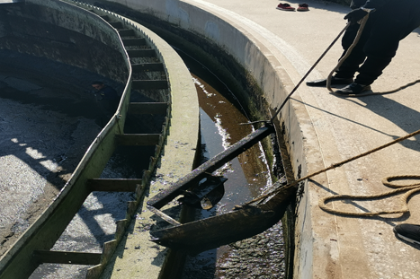 在報請分管領導同意后,各部門人員迅速行動、分工協(xié)作、密切配合,調整工藝運行方式。安排大流量水泵排水對1號二沉池進行檢查。25日14時左右,池內中心筒水位抽至80公分左右,池邊附近露出地面,在淤泥中發(fā)現(xiàn)了電柜側7號虹吸筒刮泥板脫落。另外,還發(fā)現(xiàn)了刮吸泥機橋架上有兩顆螺絲丟失。至此,技術人員的判斷得到了證實,脫落刮泥板阻礙了刮泥機正常行進,導致減速機過載,燒毀電機。