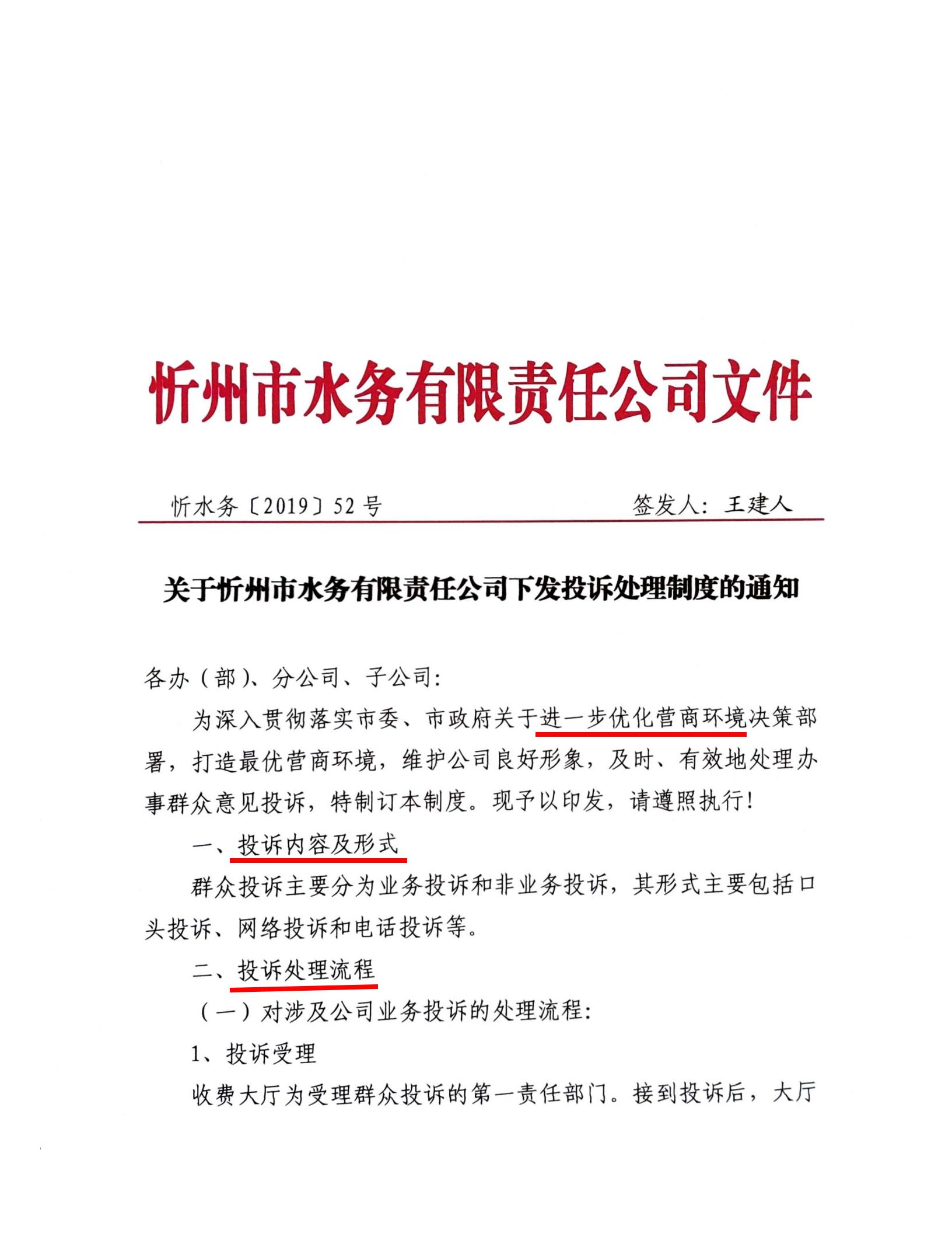 關(guān)于忻州市水務(wù)有限責(zé)任公司下發(fā)投訴處理制度的通知