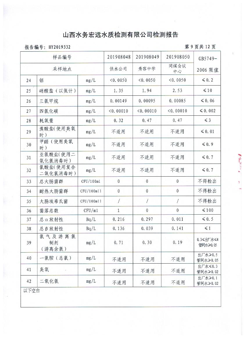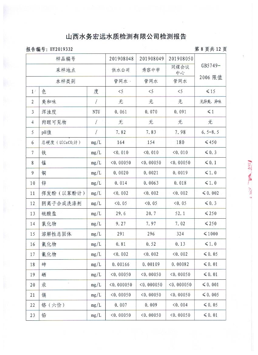 忻州城區(qū)公共供水水源水、出廠水、管網(wǎng)水、管網(wǎng)末梢水2019年8月份水質(zhì)信息公示